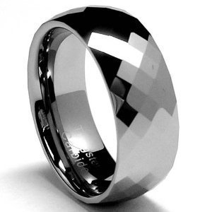 A stylish Mens Wedding Ring that will never scratch or tarnish! This multi-faceted tungsten carbide ring is 8MM in width and comfort fit. Tungsten Carbide is ranked 2nd hardest next to diamond on the Mohs scale, diamond being a 10 followed by Tungsten Carbide as 9. All of our Tungsten rings are Cobalt Free and hypoallergenic. Tungsten rings will not cause skin irritations or turn your fingers green. For a ring that will last a lifetime, go tungsten!